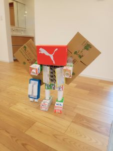 今日は家で出る牛乳パックとトイレットペーパー芯、空箱を利用して工作をしました😊✨ 1体のロボットが出来上がりました! さすが男の子! 攻撃装備がたくさん付いてました(笑)