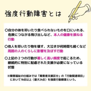 どうもこんにちは、管理者の松藤です!! 今回は強度行動障害について少し書きたいと思います。 現在、強度行動障害の研修で勉強をさせていただいております。 自閉症を持っている子達は自分で伝える事や動く事が上手くいかない事があ […]